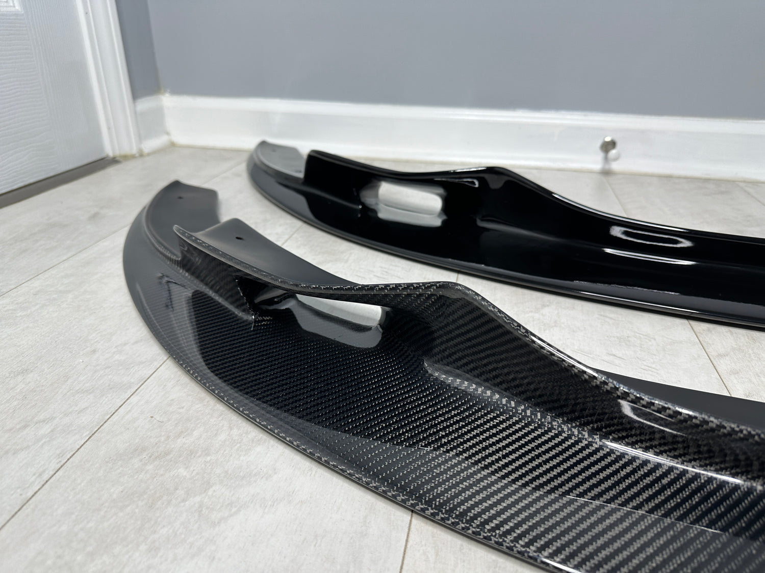 Crafted from high-quality carbon fiber sealed with a coated finish and options of gloss black, this lightweight front lip offers a perfect fit and look, enhancing your car's overall design.